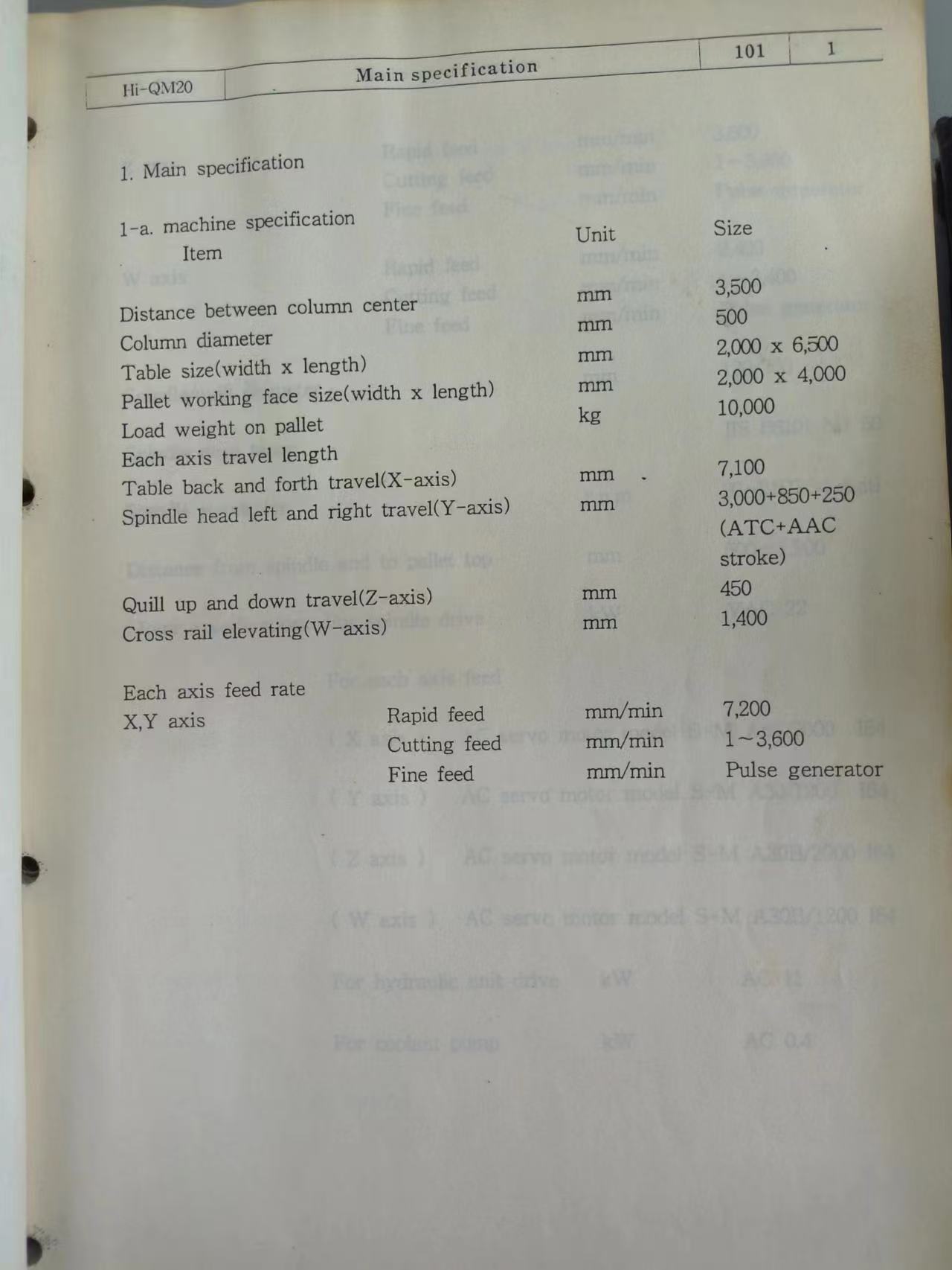 韩国精机龙门铣HI-QM20 工作台2m*7m 工作台承重10T X轴行程7000mm Y轴行程2300mm Z轴行程500mm W轴行程1100mm 过龙门宽度2800mm