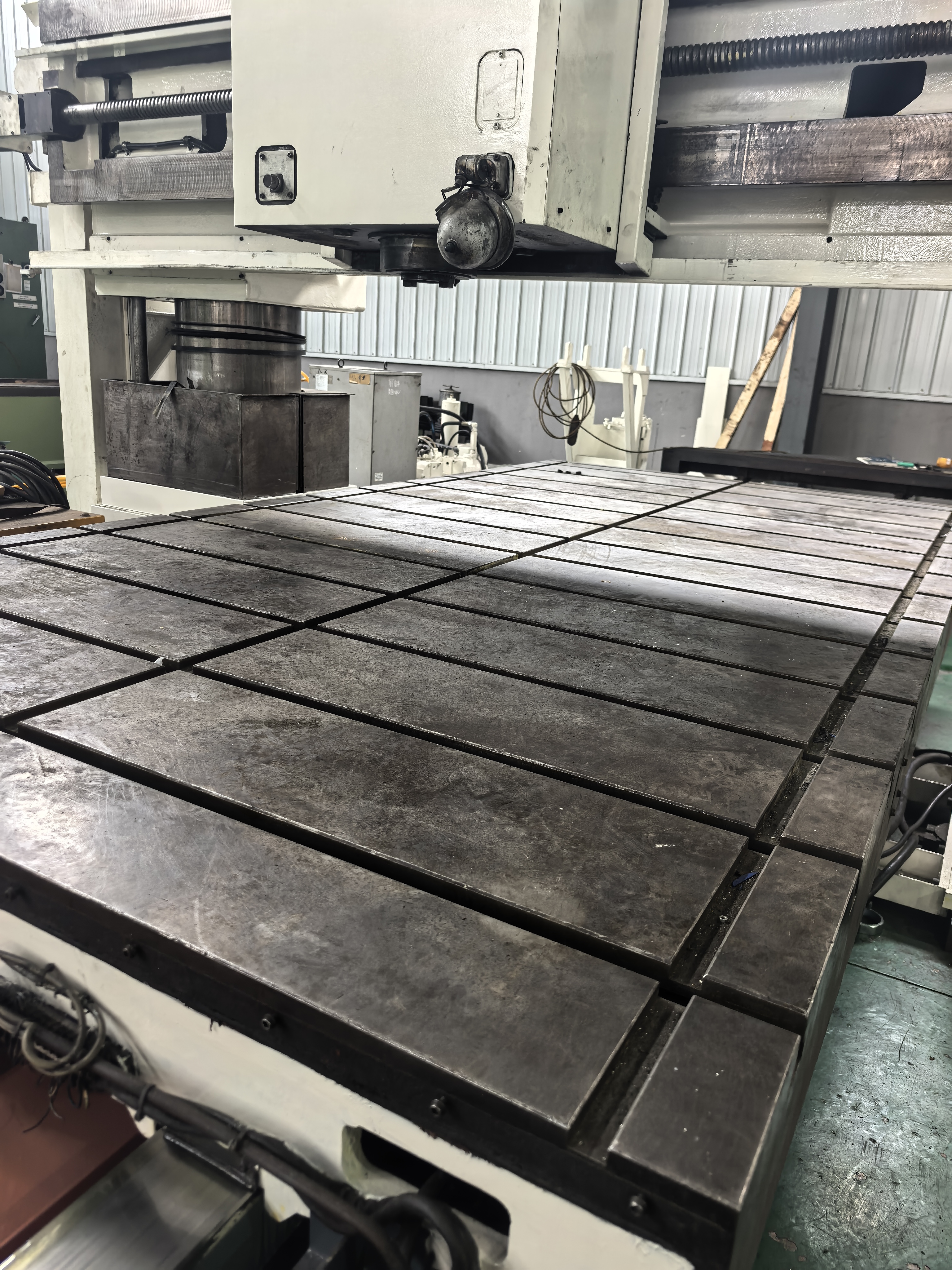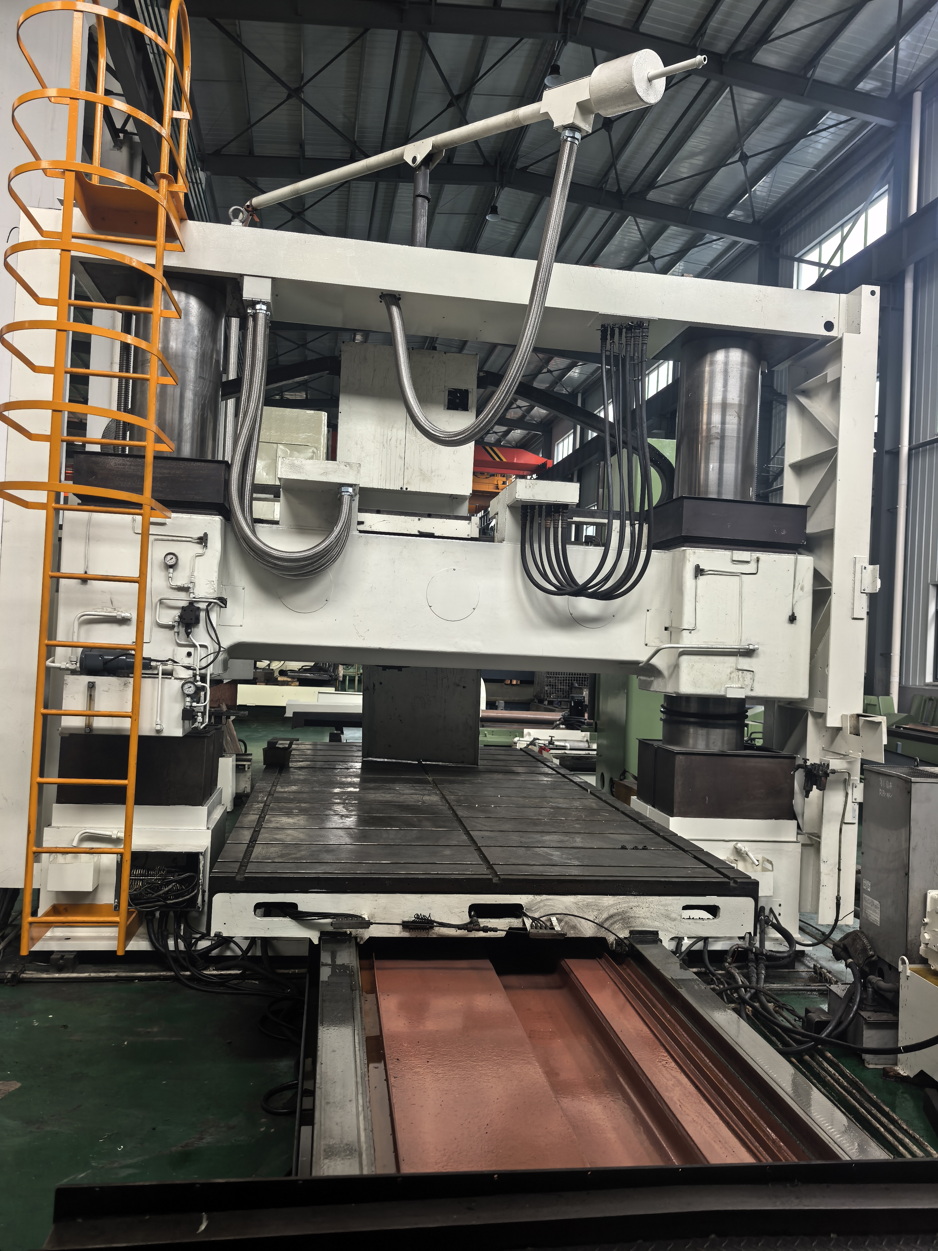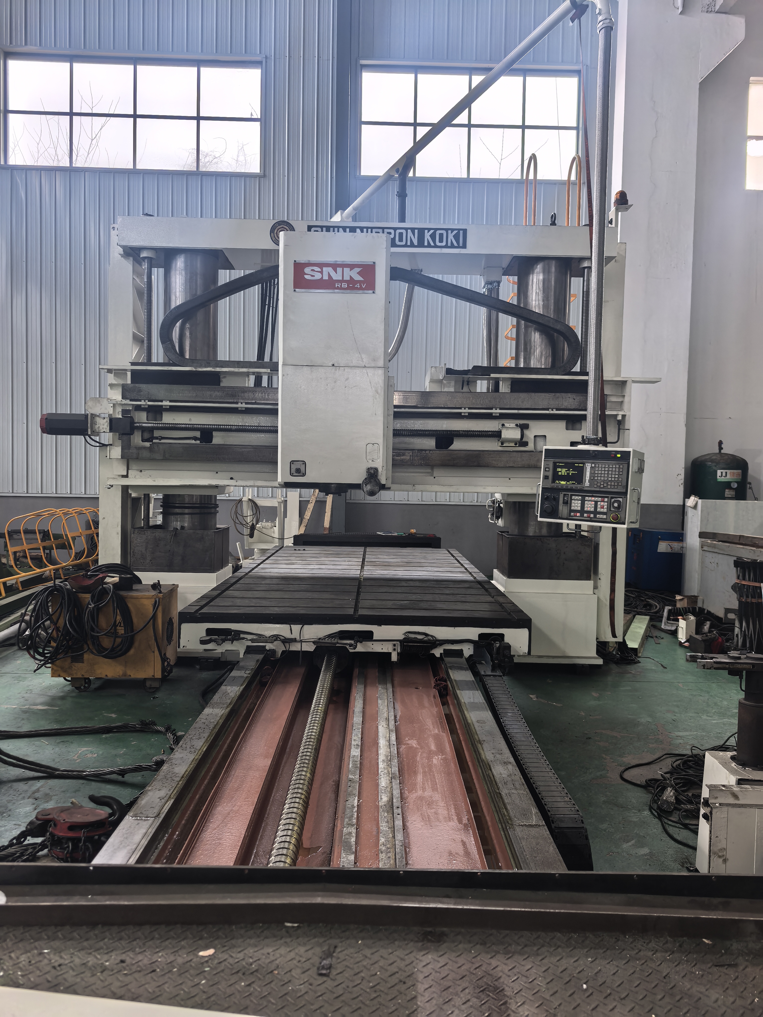 名称:新日本工机龙门 型号:RB-4V X*Y*Z轴行程:4250mm*2400*400mm W轴行程:1100mm 主轴转速:3000rpm 工作台面:2000*4000mm 工作台承重:15000kg 龙门宽度:2400mm 刀柄:BT50